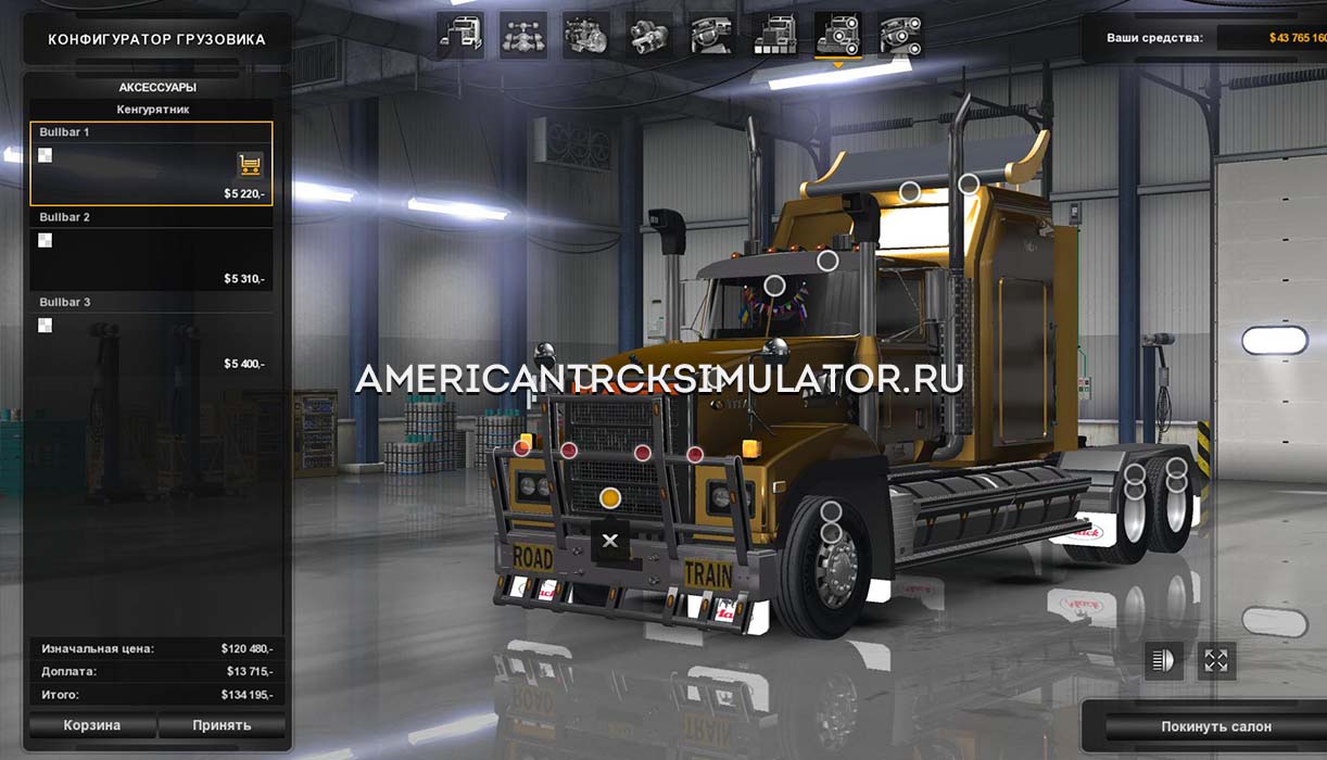 Для внешнего тюнинга предусмотрены качественные аксессуары - кенгурятник, обтекатель для крыши и фирменные флажки в кабину. В дальнейшем будет дополнен новыми деталями. Стоит обратить внимание на строгий дизайн салона грузовика, который исполнен в одном варианте.