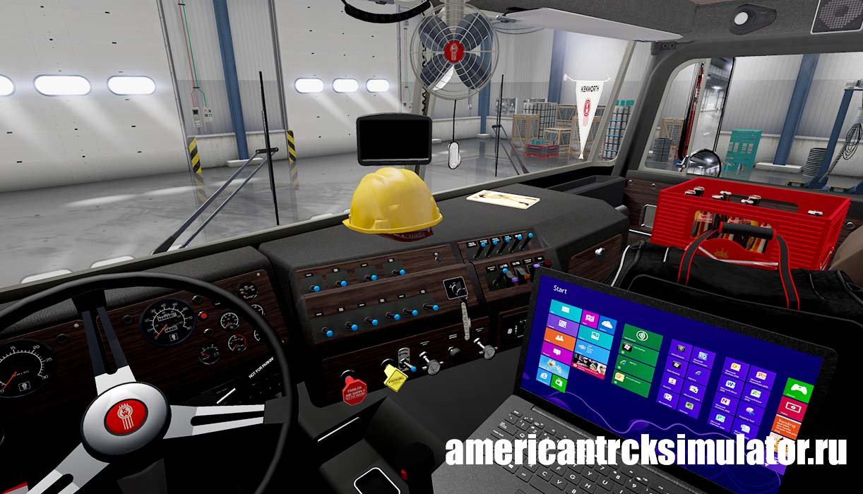 Но самое интересное это кабина водителя. В новой версии Вам доступно большое количество украшений. несколько видов игрушек на лобовое стекло, несколько GPS навигаторов, журналы, строительные каски, салфетки для торпедо, на место двигателя можно установить сумки для дальних поездок, игрушки, и ноутбук, так же доступен большой ящик пива который можно установить на место пассажира. Грузовик Kenworth K100 имеет свою физику, свой звук, оригинальные шины и диски. Так же множество уникальных скинов.