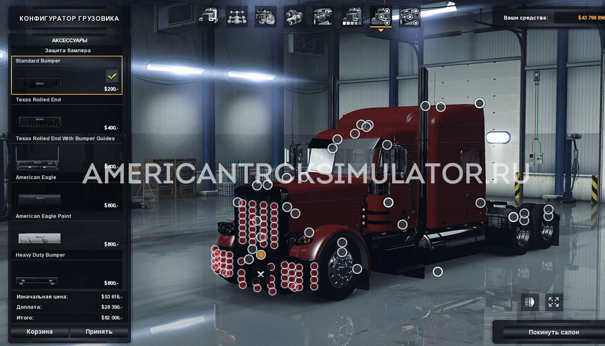 Для Peterbilt 389 доступна установка двигателя мощностью до 840 л.с., что делает его одним из мощнейших тягочей в игре. Из ряда аксессуаров для изменения внешнего вида, доступны качественно выполненные детали, например более 4 видов бамперов, дополнительные лампочки и накладки.