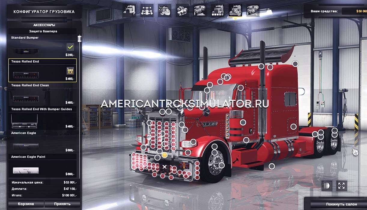 Для салона добавлено несколько цветовых вариантов с возможностью отдельной смены цвета верхней, средней и нижней частей салона. Все детали грузовика выражаются хорошим качеством и текстурами высокого качества.