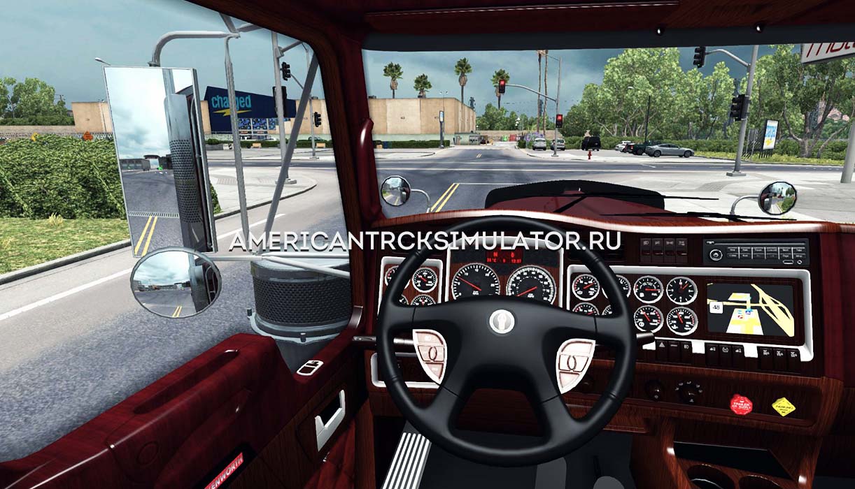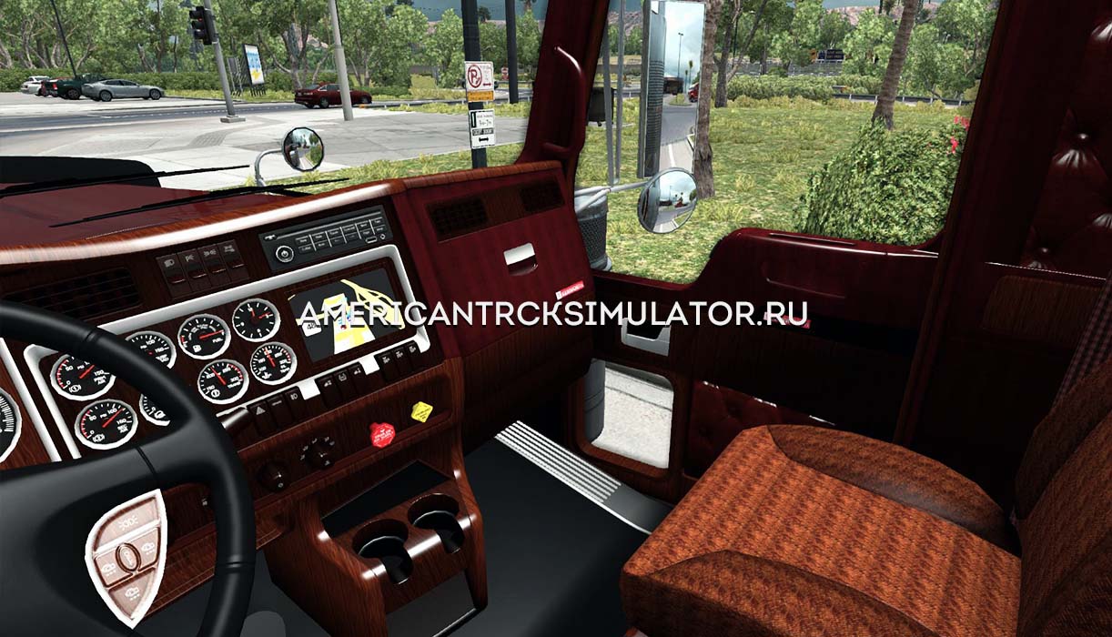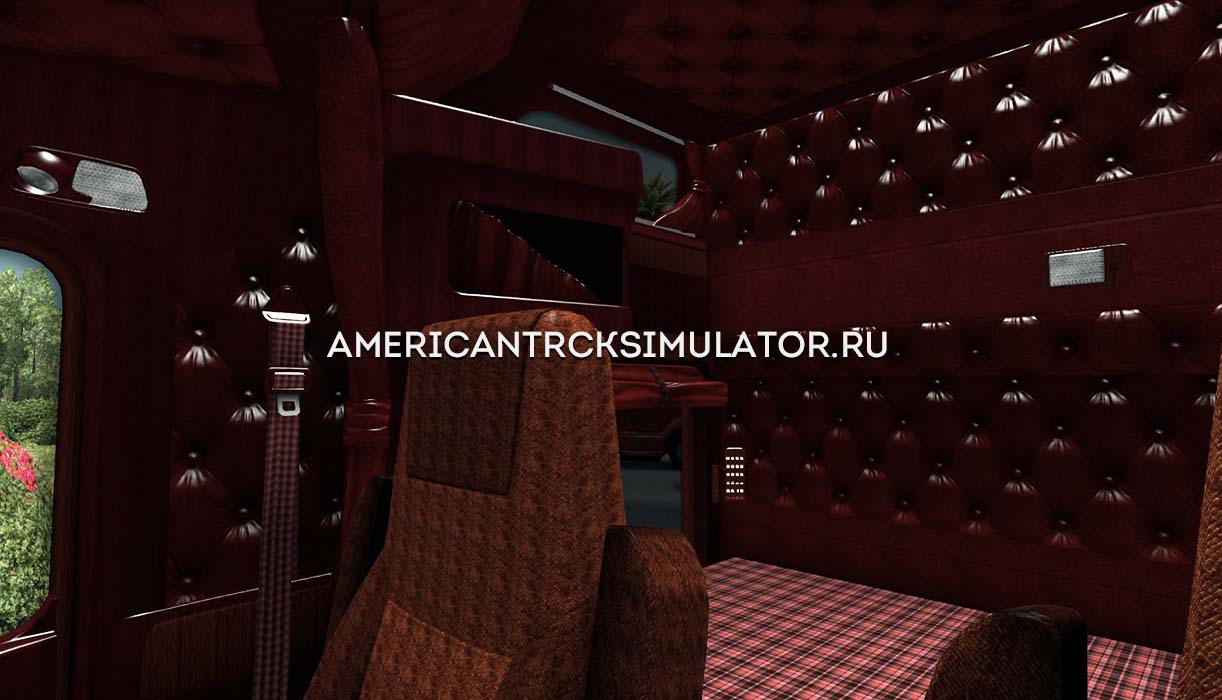 Новый интерьер для грузовика Kenworth W900. Выполненный из дорогих и качественных материалов, интерьер придает салону грузовика роскошный вид. Основной цвет темно - коричневый из которого выполнена обшивка салона. Декоративные накладки для некоторых частей салона изготовлены из дерева, что превосходно считается с цветом обшивки. Так же для приборной панели добавлен GPS.