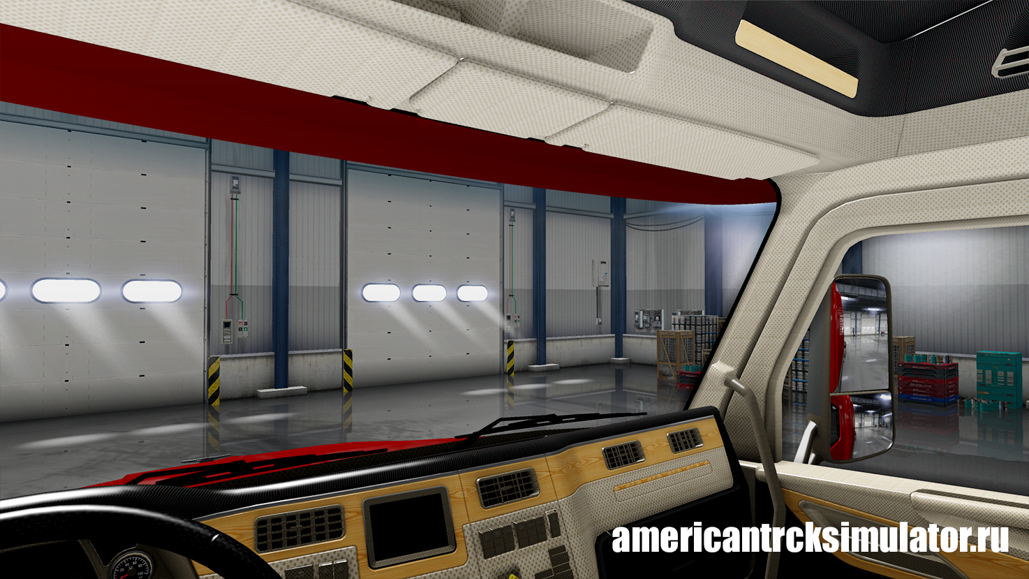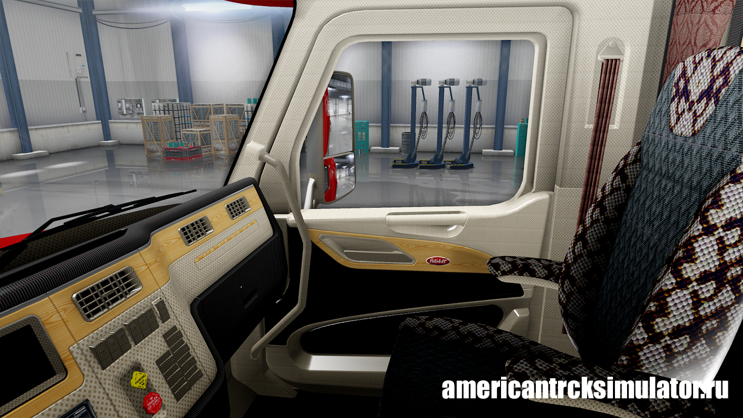 Данный мод заменяет стандартный салон грузовика Peterbilt 579 на новый. Более современный лаконичный салон, выполненный в кремово - черных тонах. По некоторым деталям интерьера установлены деревянные вставки. Сиденья пассажира и водителя обшиты серой тканью с бело-красным узором.