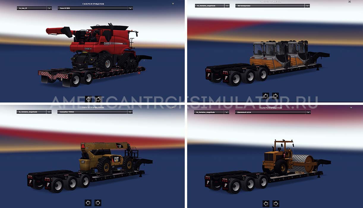 В игре каждый из трейлеров имеет значимое отличие друг от друга, что разнообразит Ваш игровой процесс. Для грузоперевозок будут доступны более семи уникальных грузов, например громадный экскаватор или манипулятор фирмы CAT. Весь список грузов и прицепов выполнен из высокодетализированных текстур, что придает им реальный вид в игре.