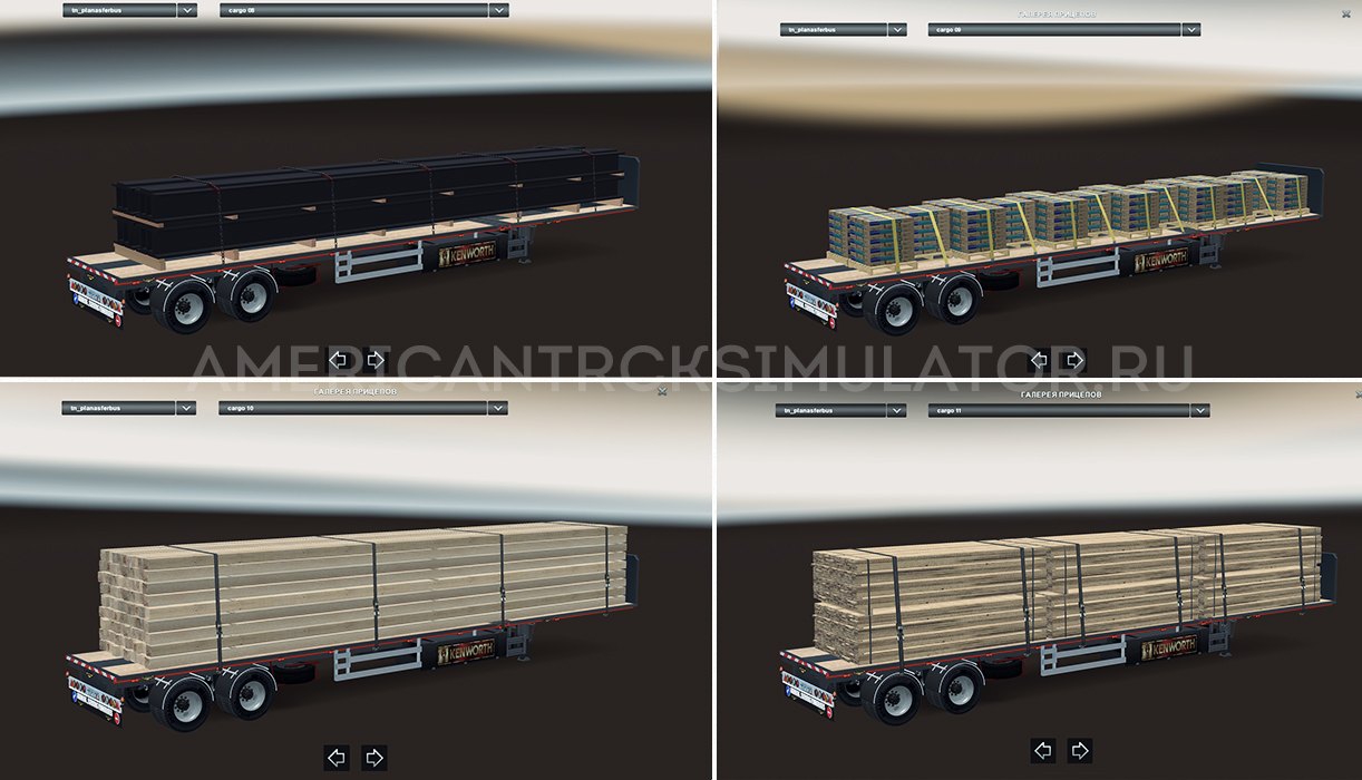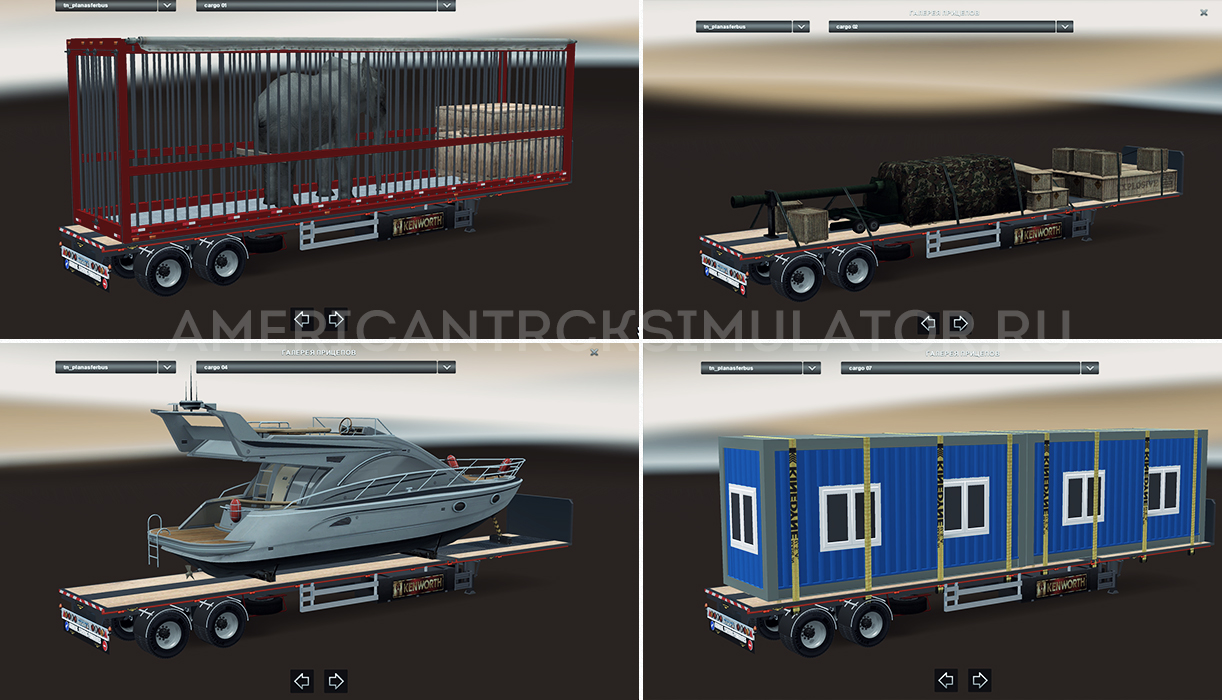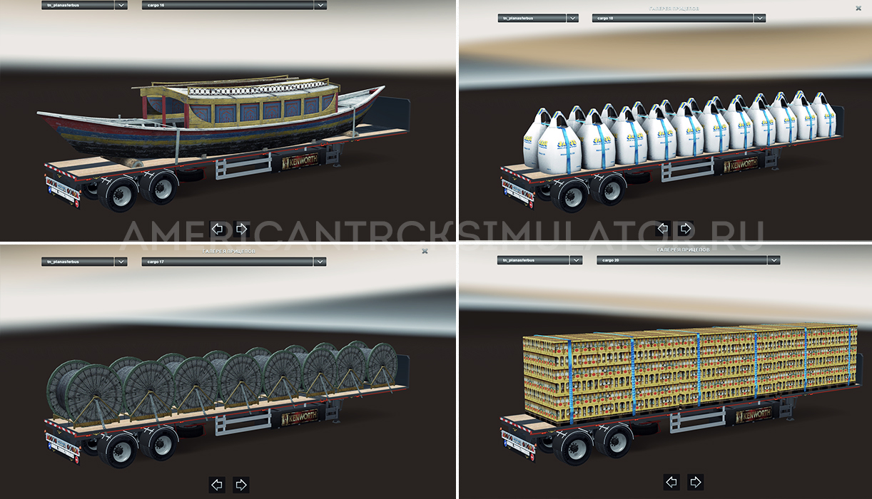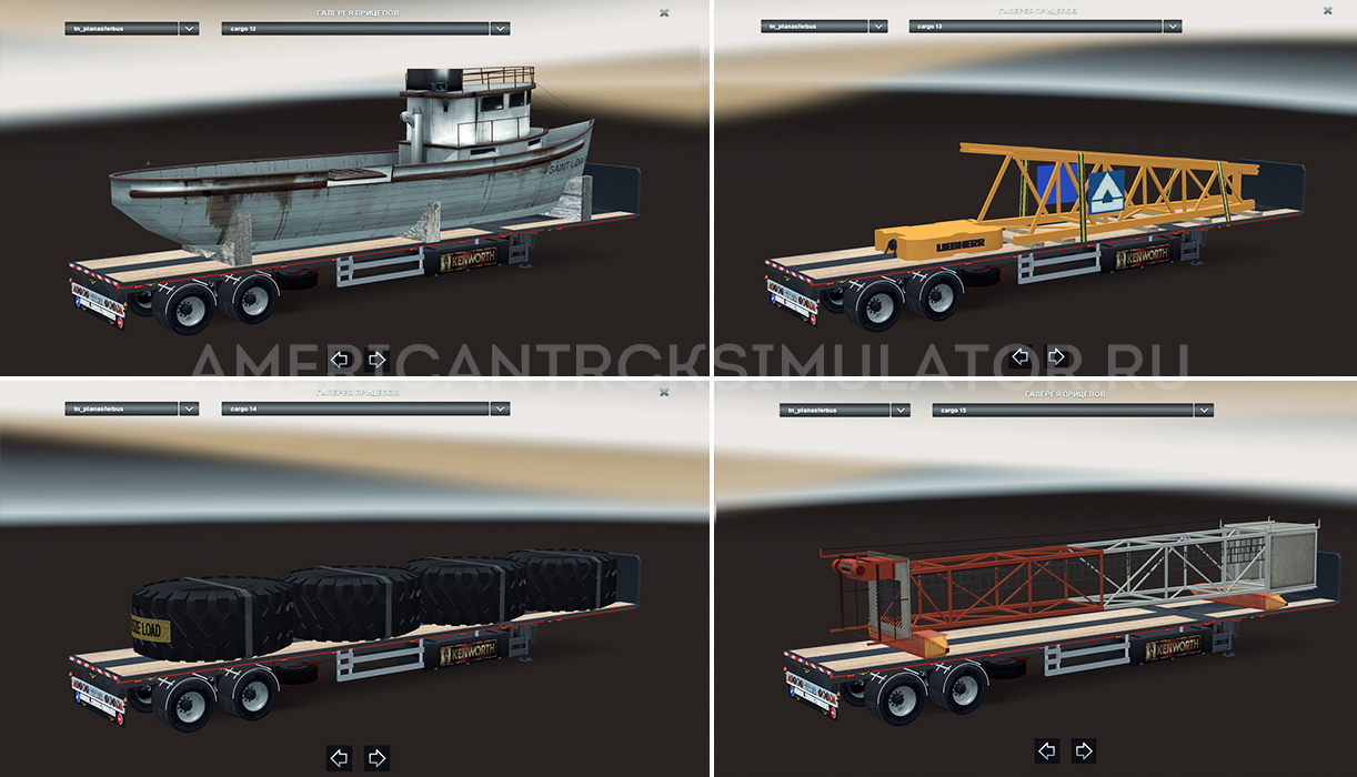 В пак вошли уникальные виды грузов разнообразных категорий и размеров. Для осуществления перевозок в игре доступна длинная открытая платформа с фирменным логотипом Kenworth. На данный вид прицепа возможно устанавливать более 20 видов груза. Например дорогостоящую яхту или небольшой самолет.