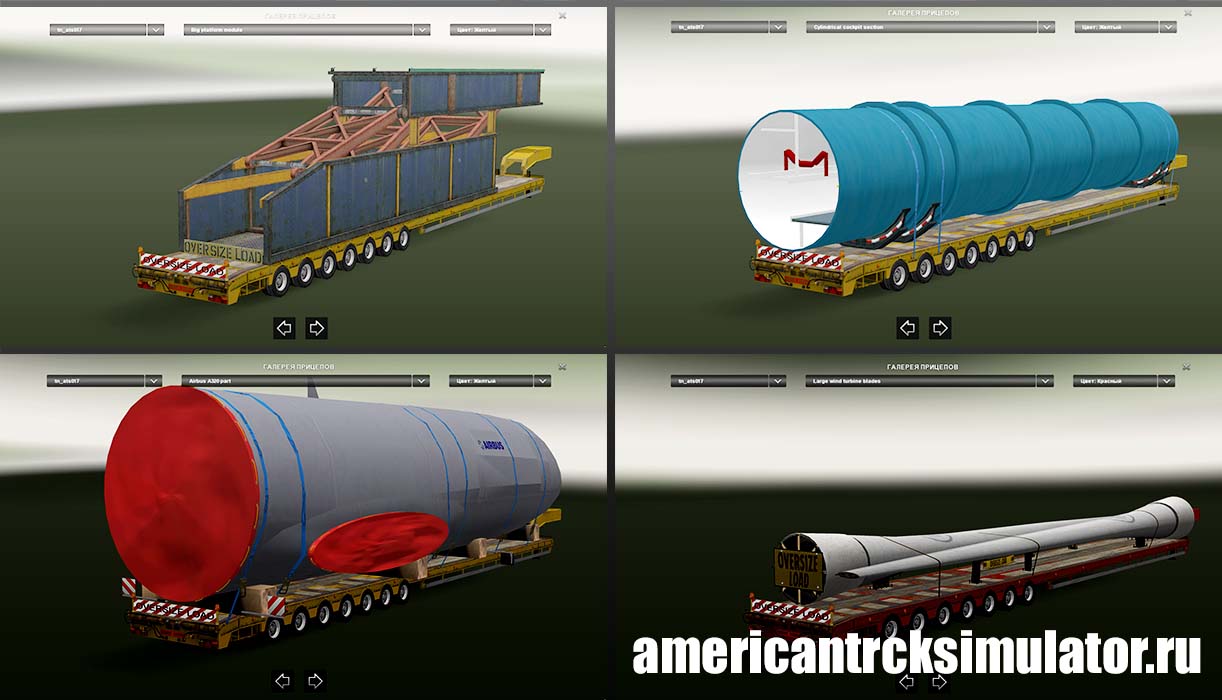 У вас есть возможность перевозить модуль кузова самолета Airbus, большой трансформаторный модуль, маневровый тепловоз времен СССР, ветряную конструкцию, модульные офисы и прочие негабаритные грузы. Все прицепы автономные и не заменяют стандартные, добавлены в трафик.