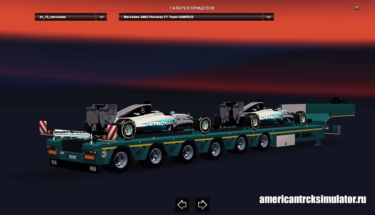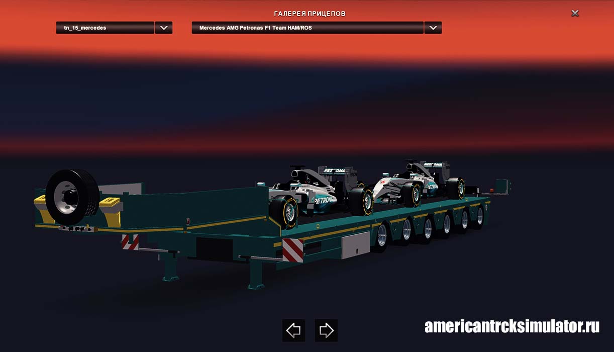 Модификация выполнена в виде длинной открытой платформы с шести осями, две из которых подъемные. На борту прицепа установлены гоночные болиды Mercedes AMG. Соблюдены реальные размеры болидов, так же выполнены из множества HD деталей, что делает мод качественным.