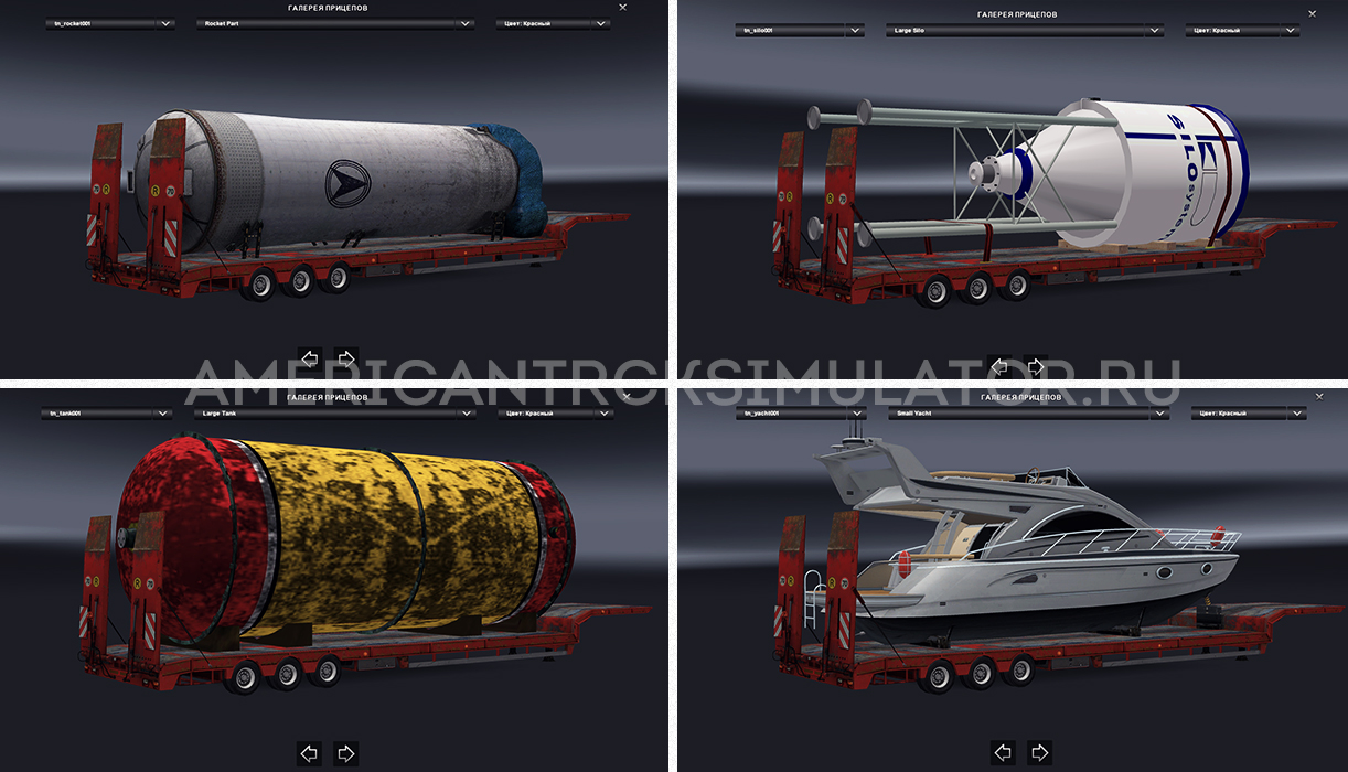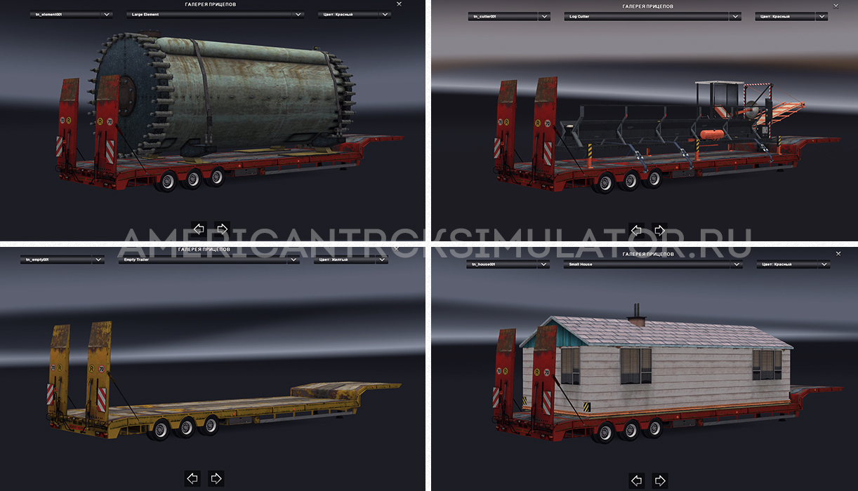 Представляем пак автономных прицепов для American Truck Simulator с негабаритными грузами. Мод содержит 9 прицепов в виде отрытой трехосной Flatbet платформы с откидными задними трапами, разных цветов - желтый, черный, красный.