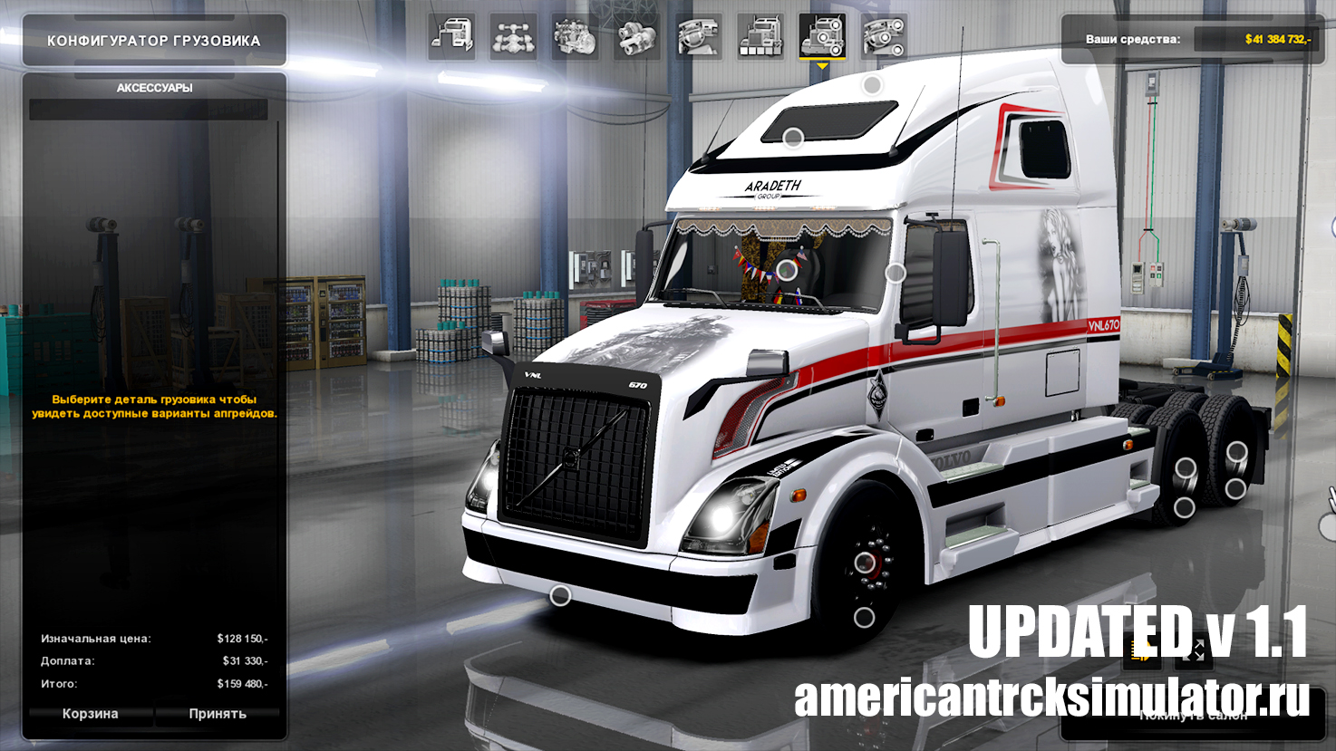 данный мод добавляет в игру грузовик Volvo VNL 670 для American Truck Simulator. Типичный американец, роскошный, мощный и трудолюбивый. В игре Volvo VNL 670 можно приобрести в автосалоне Peterbilt. Volvo VNL 670 поддерживает свои звуки, свою подвеску, стандартные запчасти для тюнинга, имеет свои уникальные скины. Появилась возможность украшать салон флажками и шторами. Исправлены различные баги, которые были в предыдущей версии 1.0.