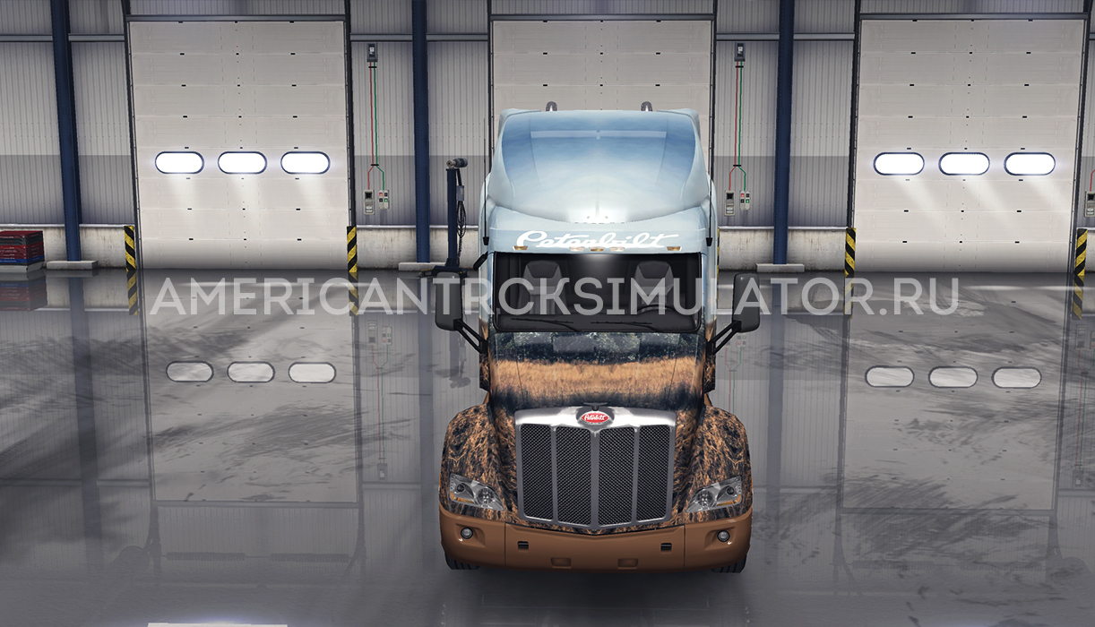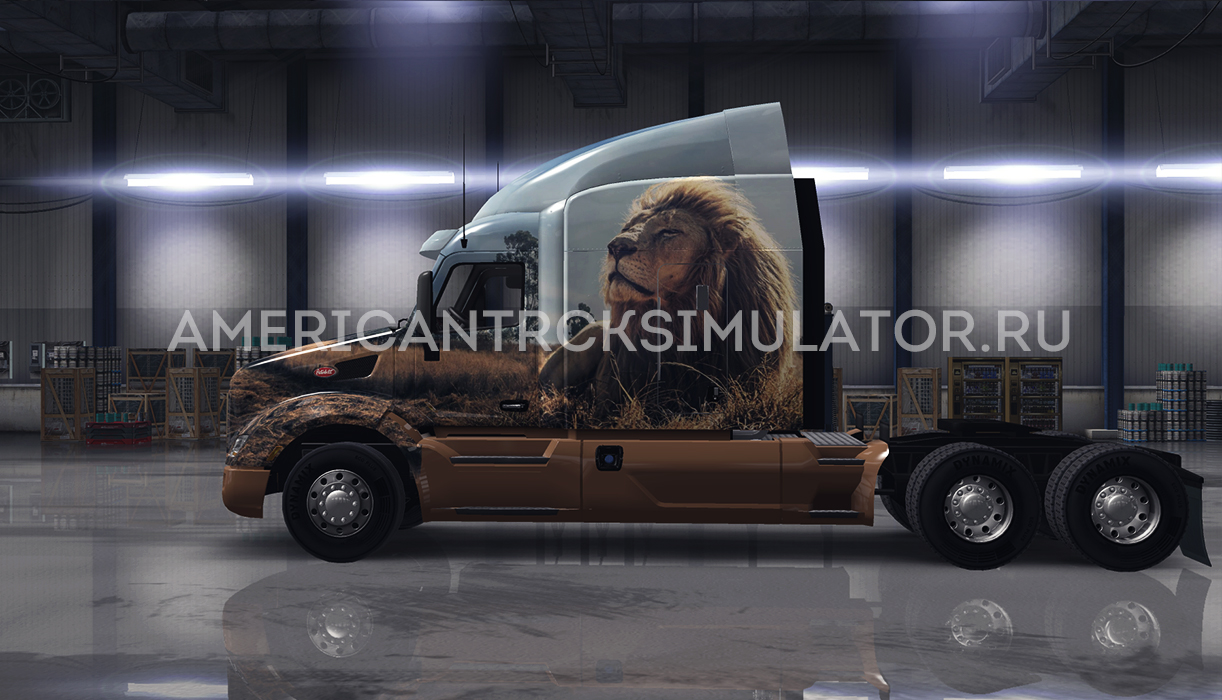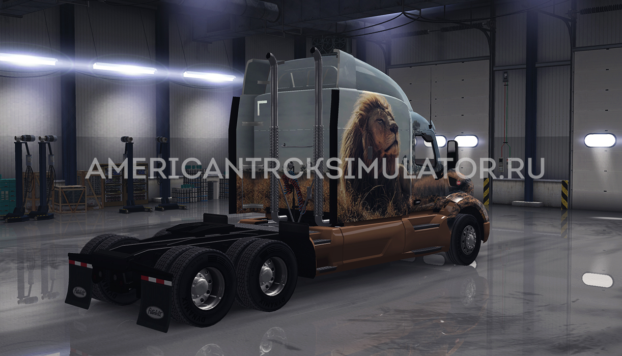 Мод добавляет в меню покраски новый великолепный скин для грузовика Peterbilt 579. На скине изображен лежащий лев на выезженной палящим солнцем траве, создавая образ хищника для грузовика. Выполнен в приятных светлых тонах. На козырьке лобового стекла нанесена надпись производителя грузовика Peterbilt.