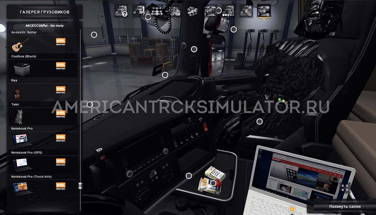 Огромный набор позволяет добавить штурманов мужского и женского пола, навигаторы, компьютеры и планшеты, банки и емкости с водой и пивом, много игрушек и другие интересные детали, которые сделают уютную атмосферу в кабине грузовика и сделают игру еще более реалистичней.