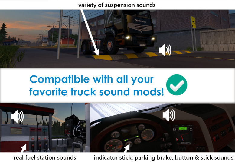 Обновленная версия звукового мода до 14.2.1, с помощью которого общие звуки в игровом мире станут еще более приближенными к реальным и захватывающими. Особенностью обновленного пака звуков является поддержка актуальных 1.2.3.X - 1.2.X версий игры. Большое количество звуковых эффектов подверглись значительным изменениям, например улучшение качества звуков грузовиков и автобусов в трафике, добавлена совместимость с приличным количеством новых карт и модов и другие новые звуки для American Truck Simualtor.